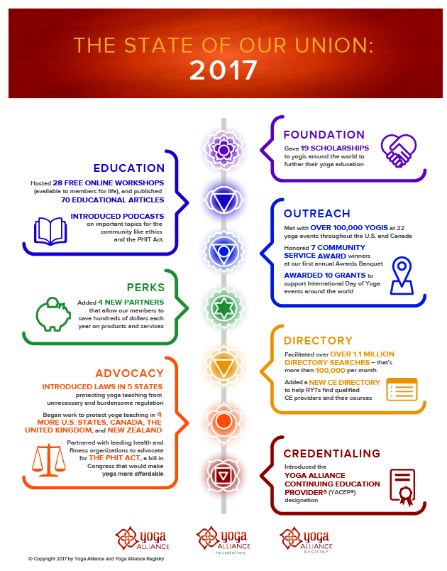 As we enter 2017, we mark another year of remarkable growth for the yoga community. Today, we’re releasing our 2017 State of Our Union—our annual report that summarizes all of the progress and key accomplishments we’ve made over the past year. This year, our State of Our Union has a new format! It's a single, simple infographic which you can download, print, and share with your yoga community.
