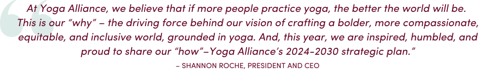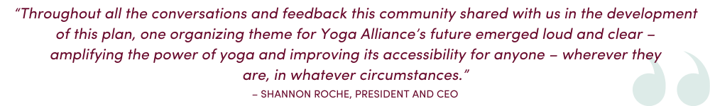 This document was written at a high level and is designed as a framework that will guide the six years’ of operational choices to come underneath it. Each year this framework will be supported by an internal implementation plan that will articulate Yoga Alliance’s intentions and goals for the year, all informed by preceding years.